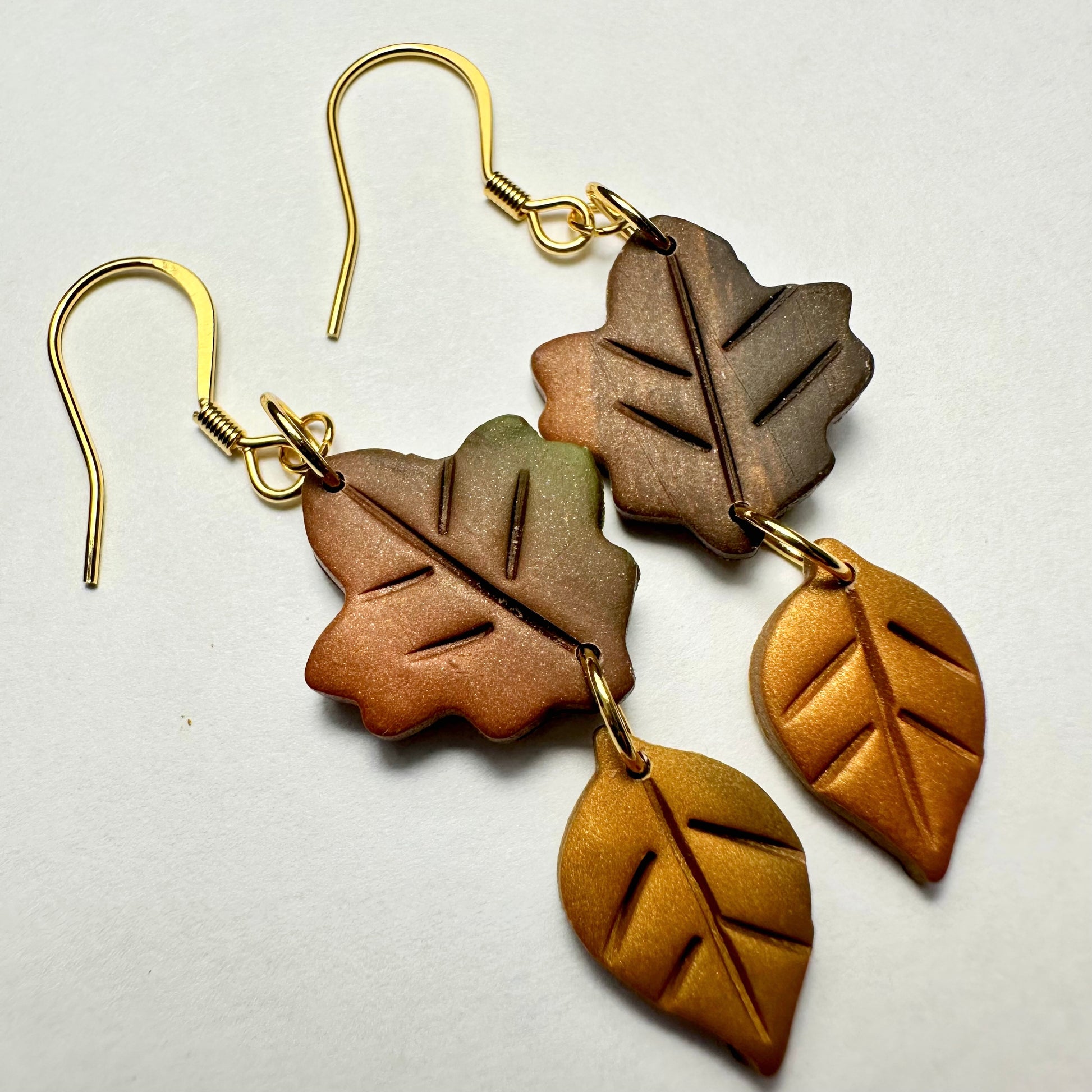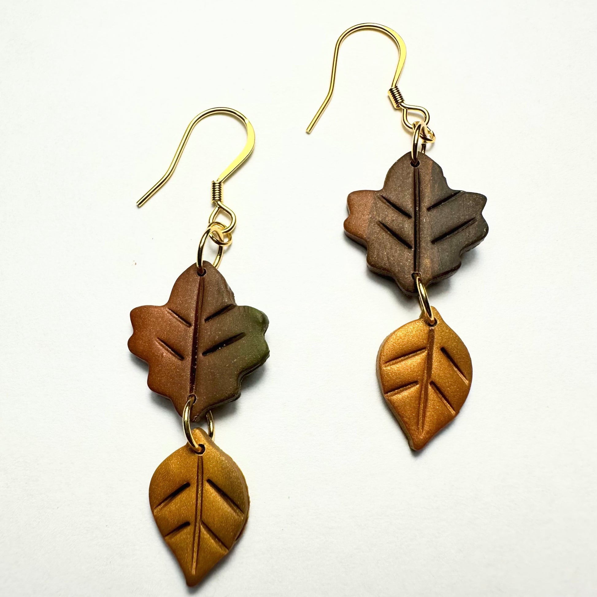 Embrace the essence of fall with our Autumn Falling Two Leaf Dangle Earrings, expertly crafted from polymer clay in a warm brown hue. These earrings feature a delicate two-leaf design, capturing the simple beauty of autumn leaves gently falling.