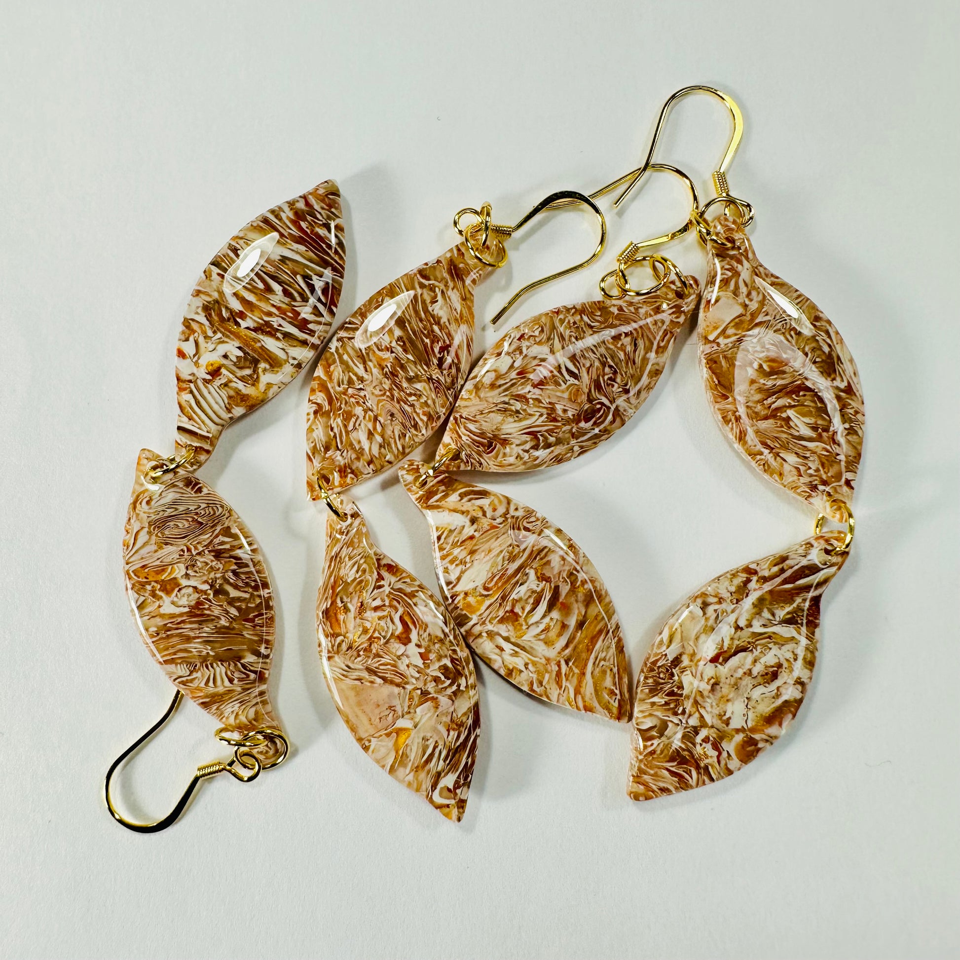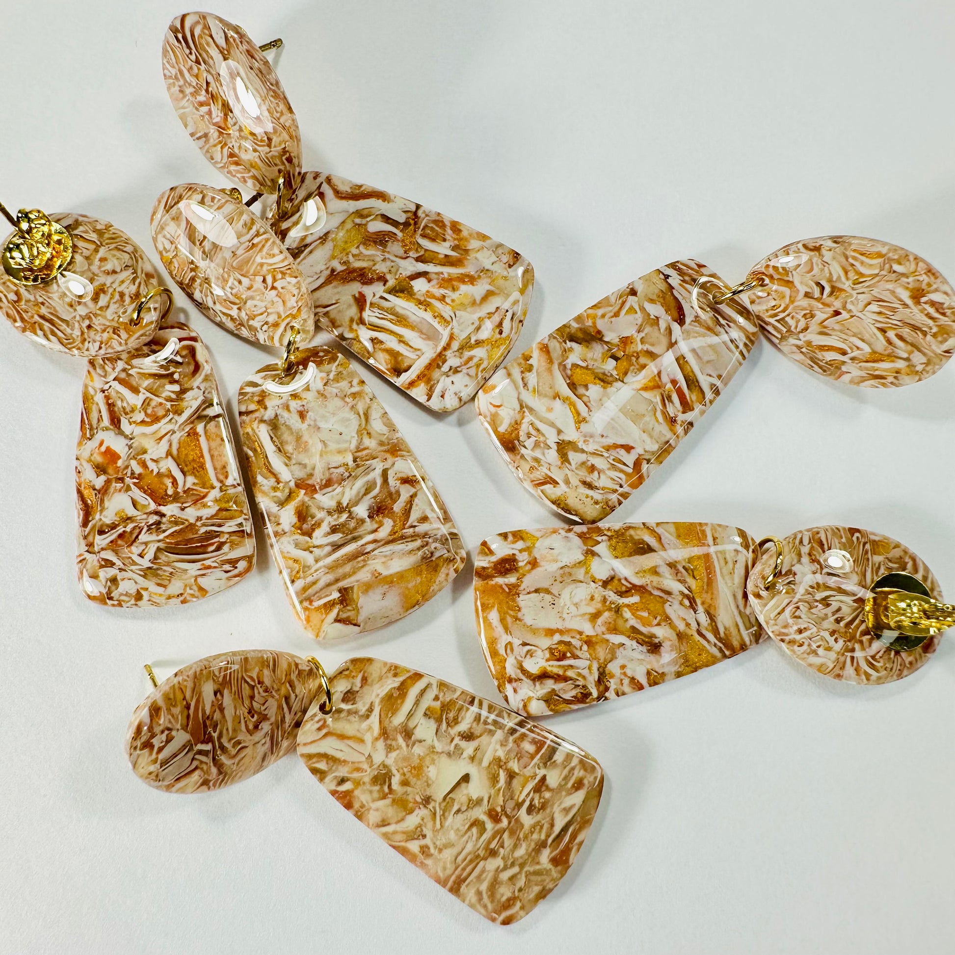 Coated with resin on both the front and back, these earrings boast a smooth, glossy finish while being durable for everyday wear. Available with both 18k gold-plated fish hooks and stud options, they offer a touch of elegance to their cozy, earthy charm.