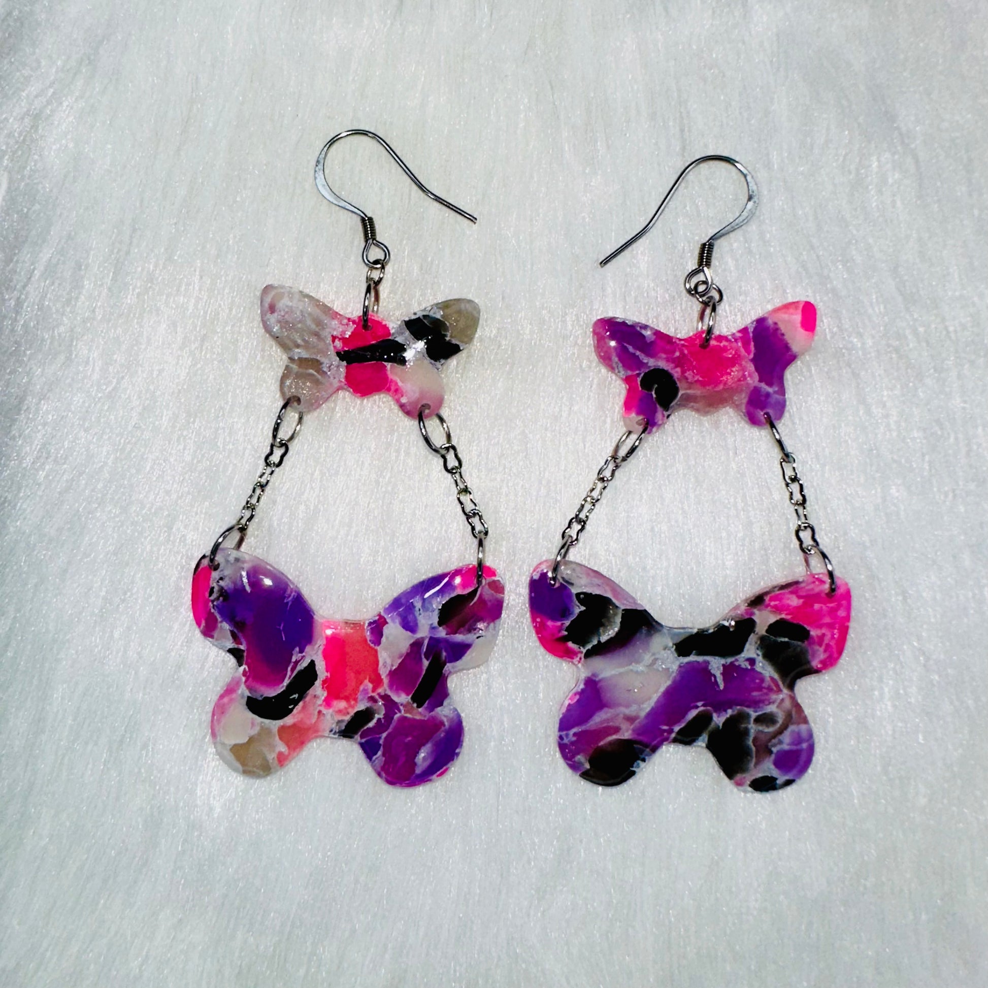 Let your style take flight with the Butterfly Drift Dangle Earrings from Vanessa Lee Clay Jewelry. These colorful two-piece earrings feature hand-sculpted polymer clay butterflies in a lively mix of multicolored hues, perfect for adding a touch of whimsy and charm to any look.