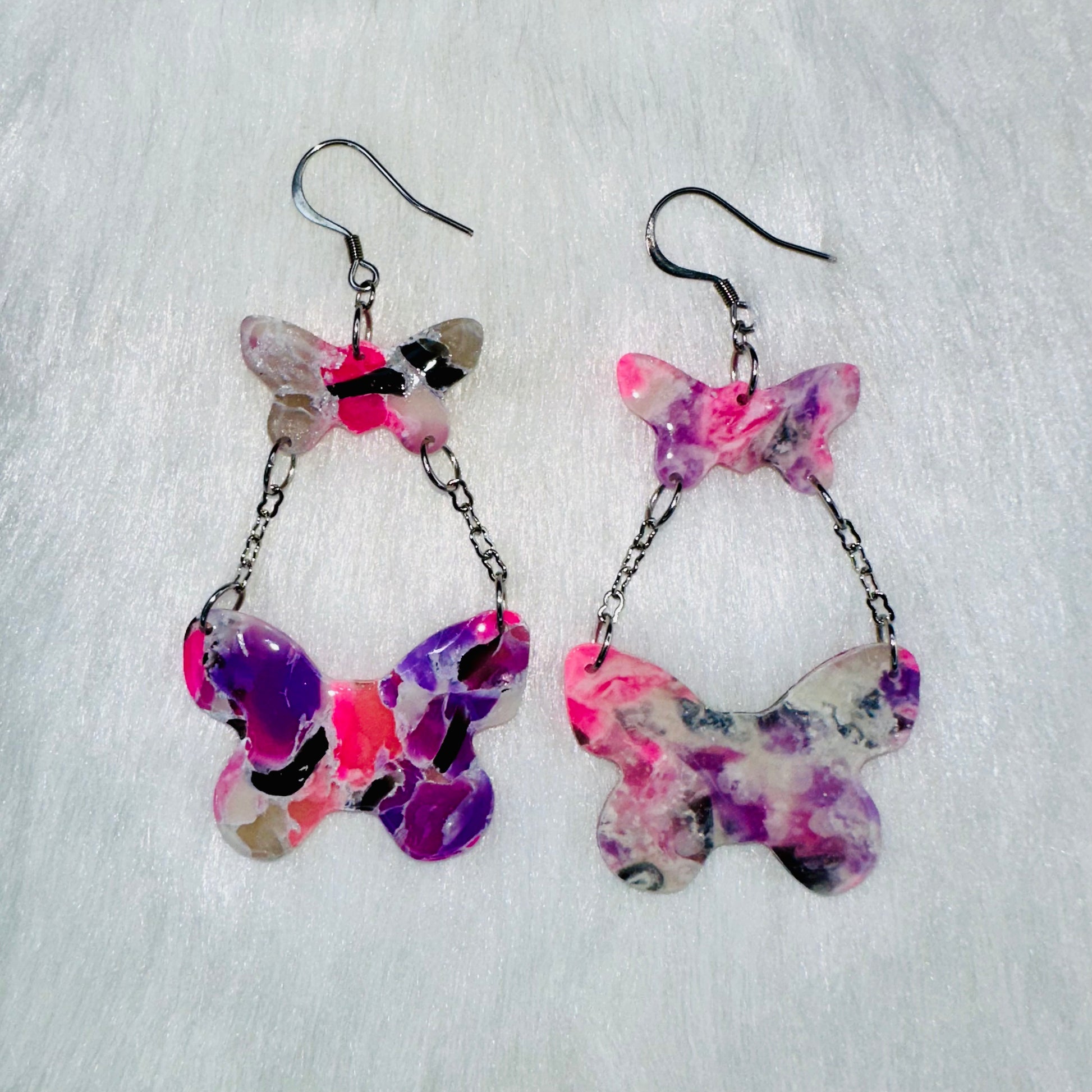 Coated in a glossy UV resin for extra shine and durability, each fluttering piece is suspended from stainless steel fish hooks—ideal for comfortable, all-day wear. Measuring approximately 2 inches long by 1.25 inches wide, these earrings are lightweight and full of movement, making them a joyful statement for nature lovers and free spirits alike.