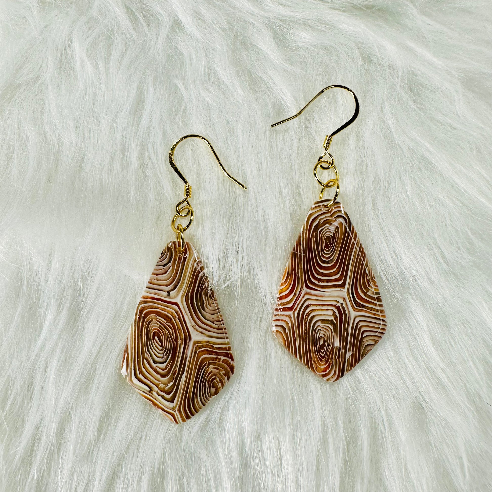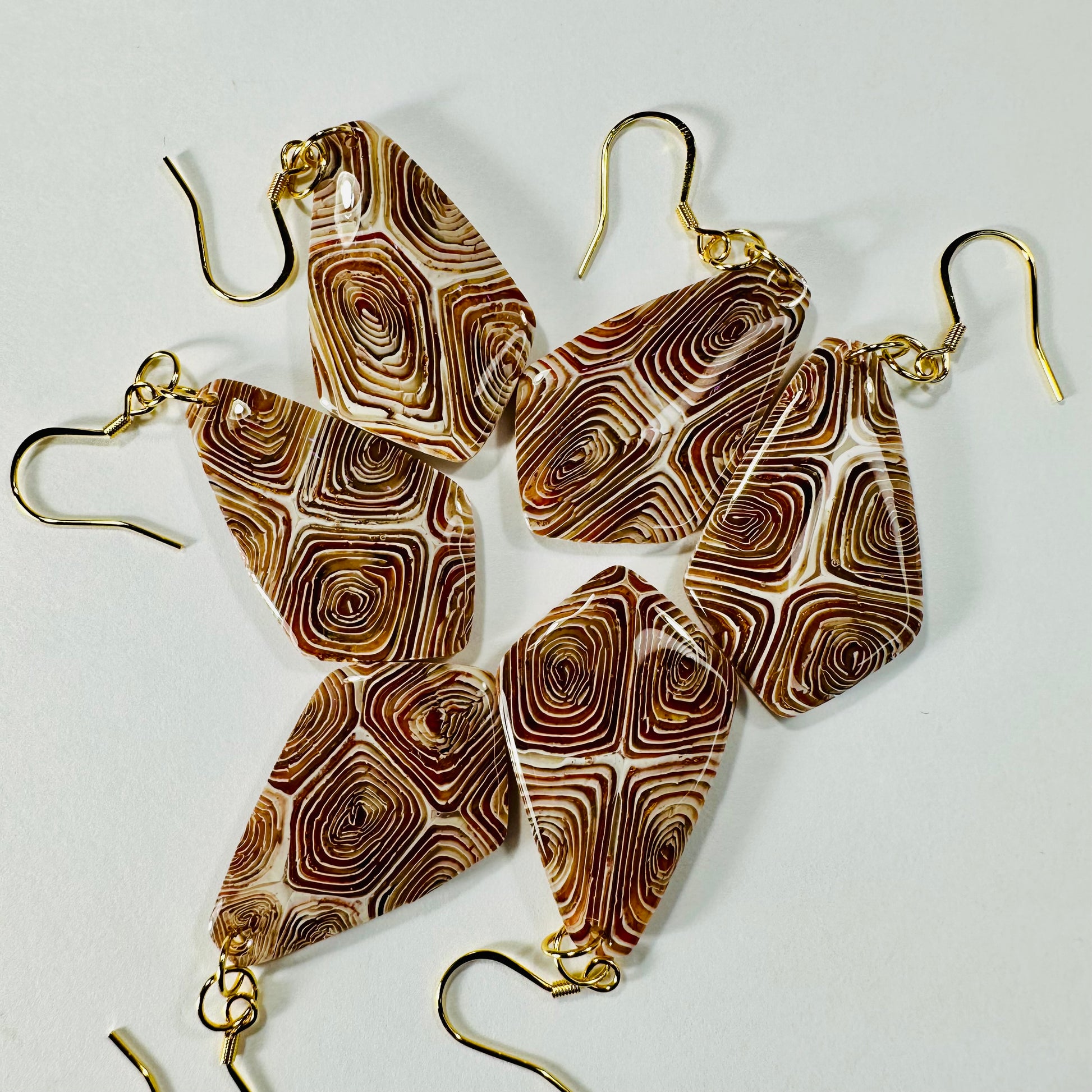 Protected with a resin coating on both the front and back, they have a glossy finish that enhances their beauty while providing extra durability. The earrings are adorned with elegant 18k gold-plated fish hooks, adding a luxurious touch to their rustic charm.