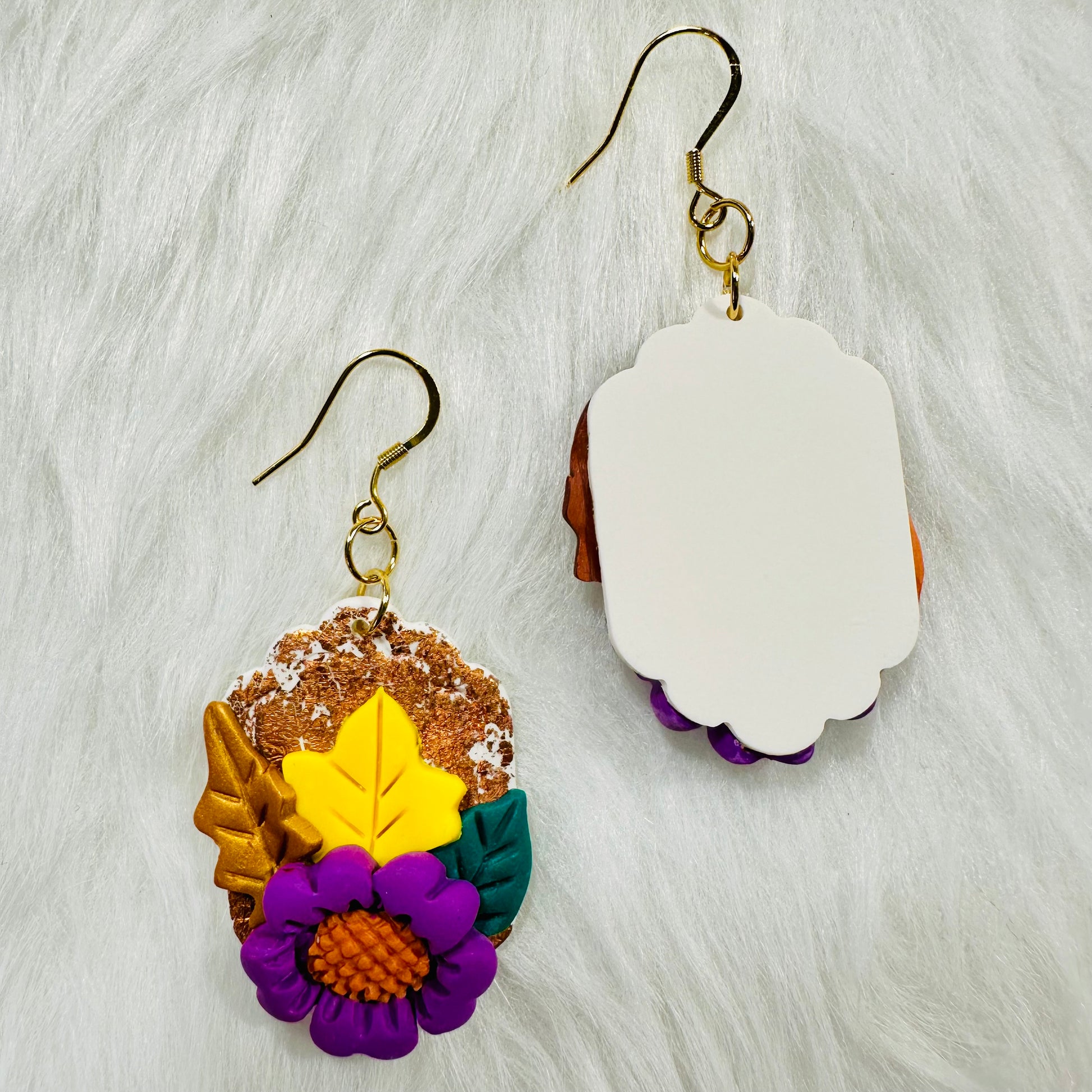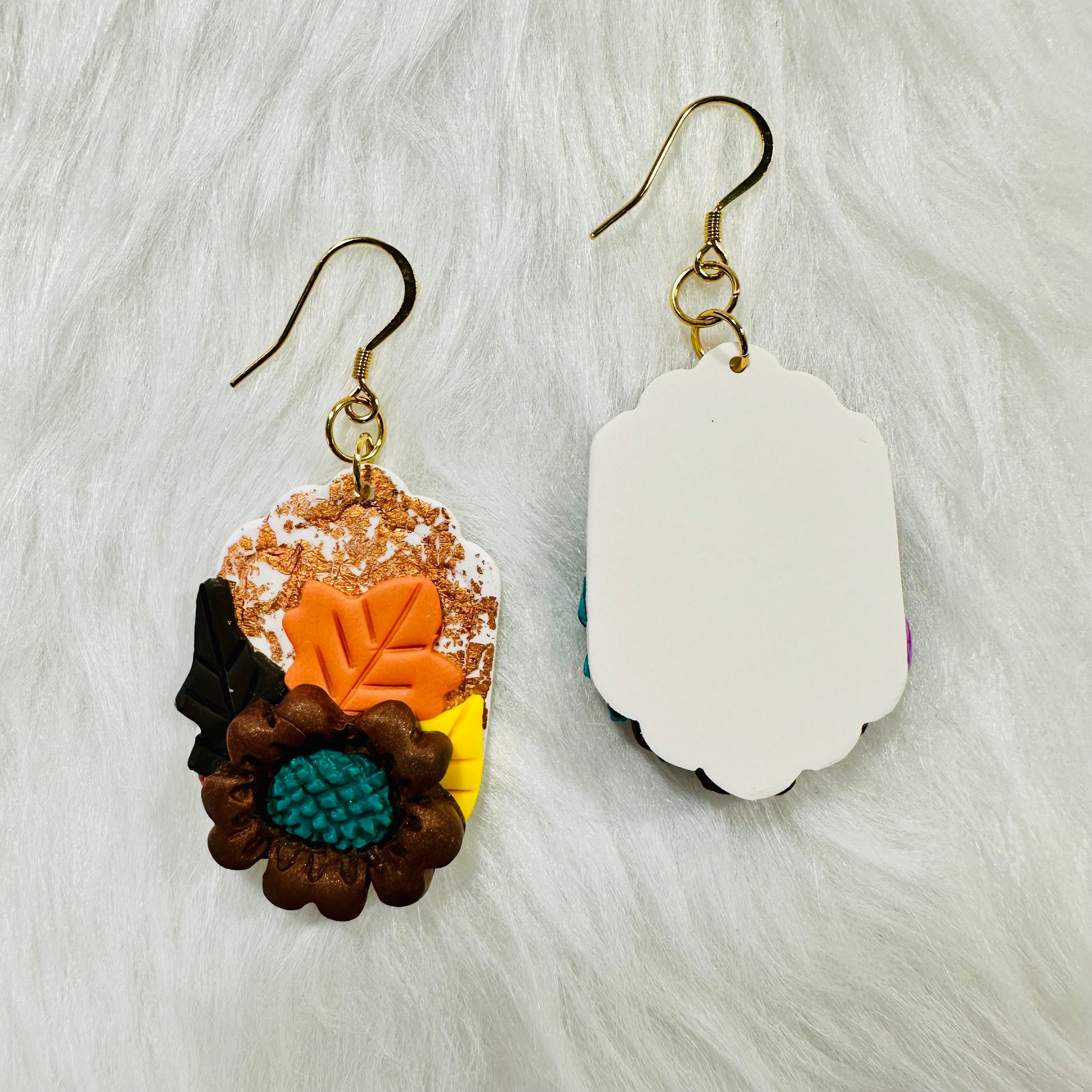 Hanging gracefully from 18k gold-plated fishhooks, these earrings combine luxury with comfort, making them perfect for everyday wear or special occasions. Due to the delicate nature of the handcrafted clay, they are fragile and should be handled with care to maintain their intricate detail.