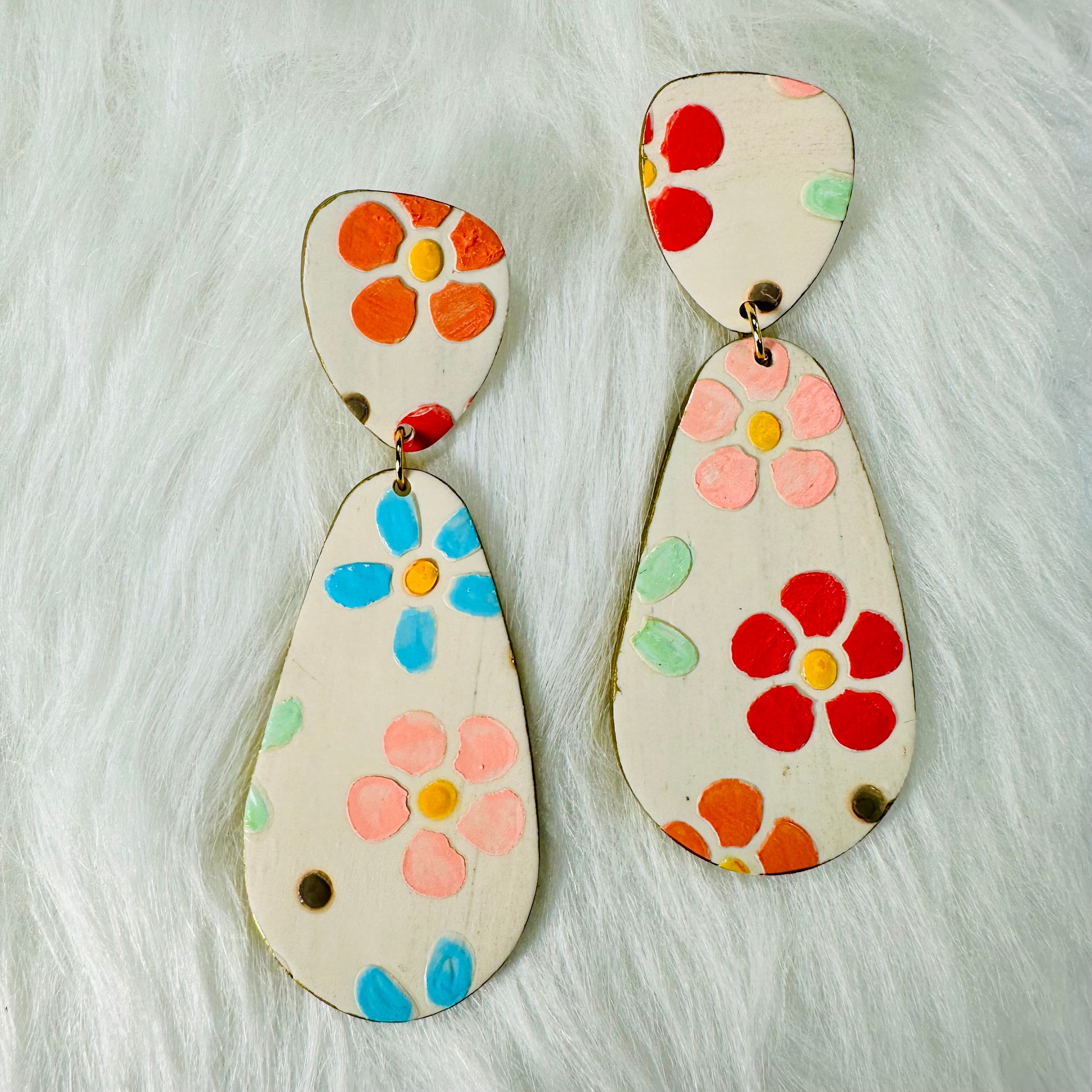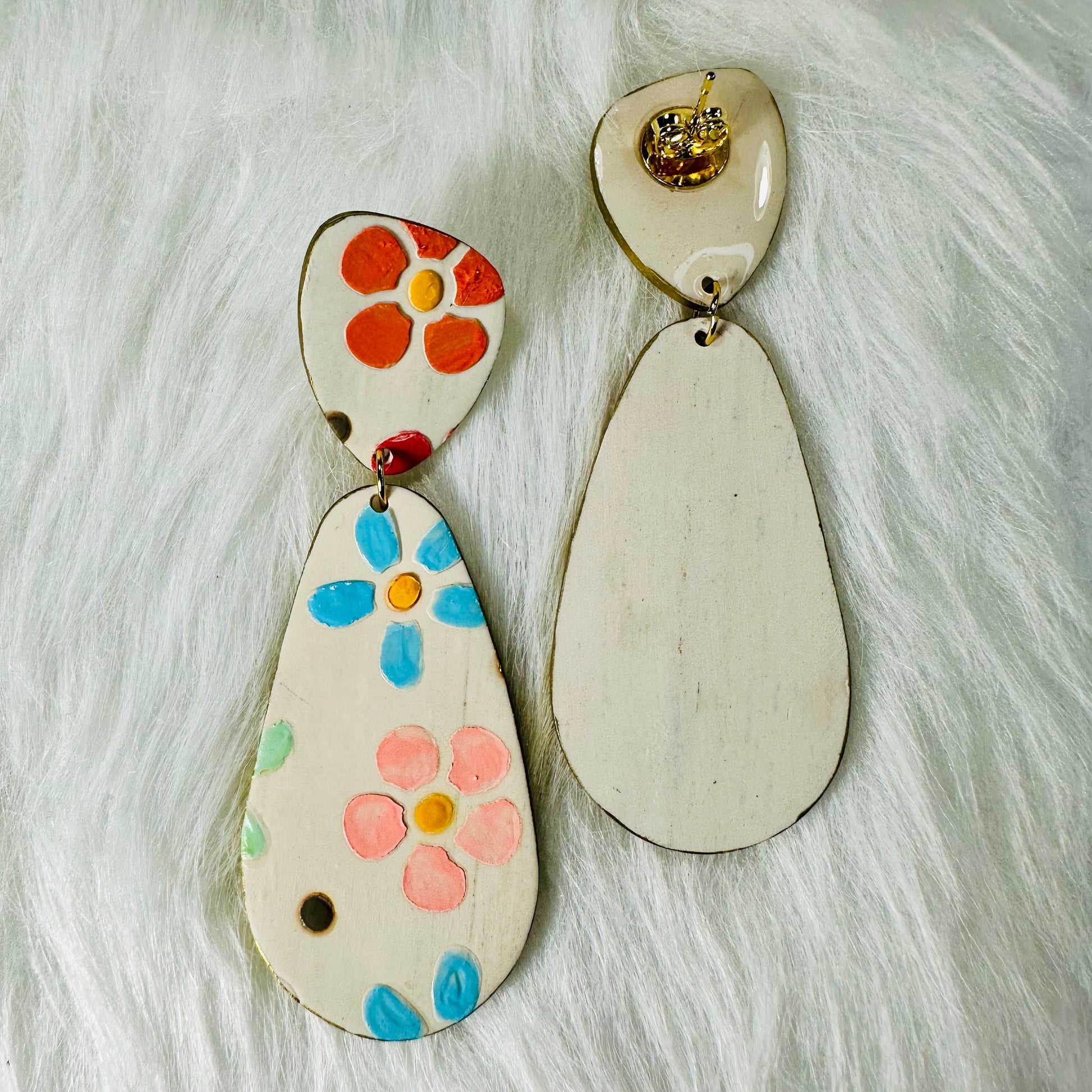 Introducing our Flower Teardrop Polymer Clay Earrings, where artistry meets elegance. Each earring showcases a vibrant, multicolored flower design hand-painted with acrylics, and finished with a delicate glaze on the flowers for a subtle, eye-catching shine. The unglazed matte finish highlights the intricate details and unique textures of the design.
