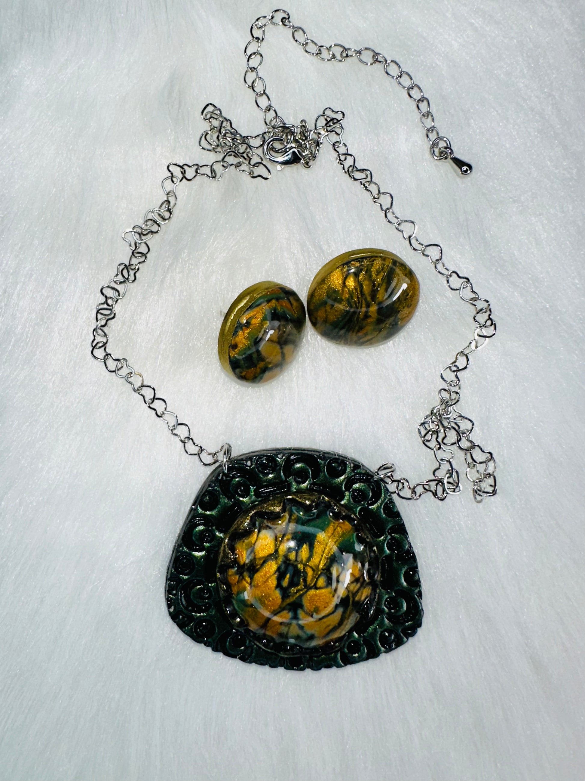 Bring bold energy and celestial shimmer to your look with the Mystic Stone Necklace & Earring Set from Vanessa Lee Clay Jewelry. Handcrafted from polymer clay and finished with a stunning faux labradorite effect, this dreamy duo swirls together deep tones of gold, black, and blue—capturing the magic of moonlit stones without the weight (or the price tag).