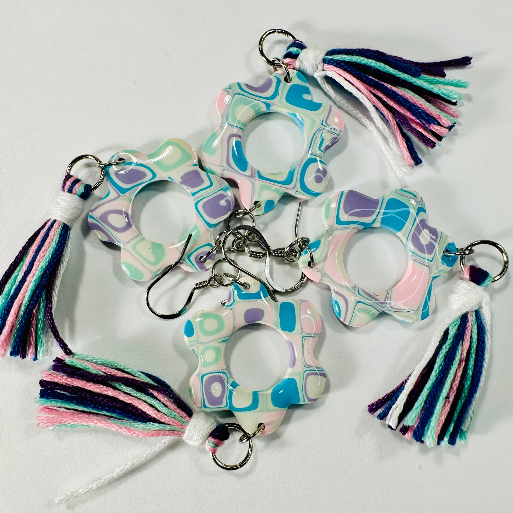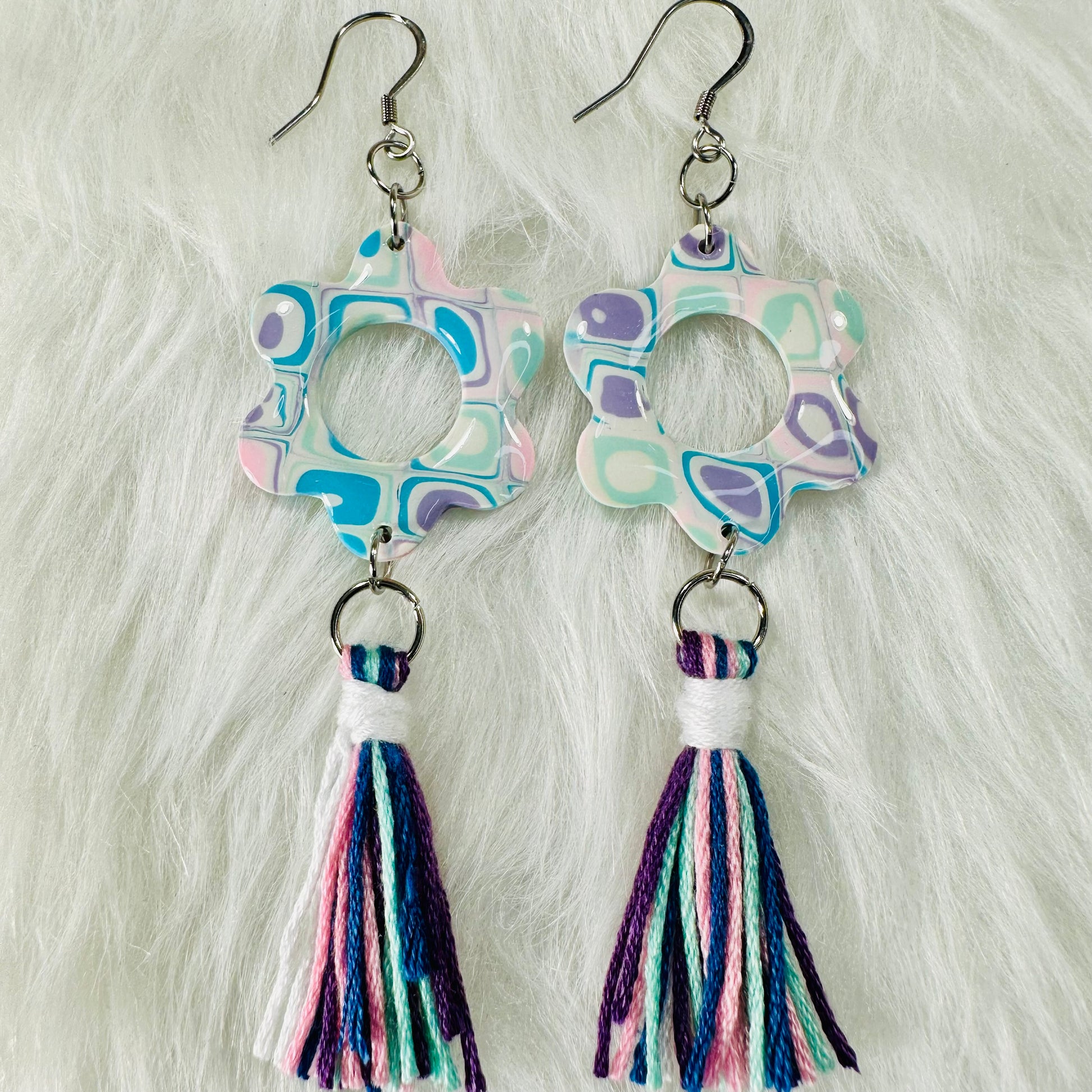 These earrings are not just about looks – they are designed for comfort and durability too. The front and back is coated with UV resin, adding an extra layer of protection and a smooth, glossy finish. They dangle elegantly from 17mm stainless steel fishhook earwires, which are hypoallergenic and gentle on sensitive ears. Each pair is adorned with handmade tassels, adding a fun and dynamic flair to your ensemble.