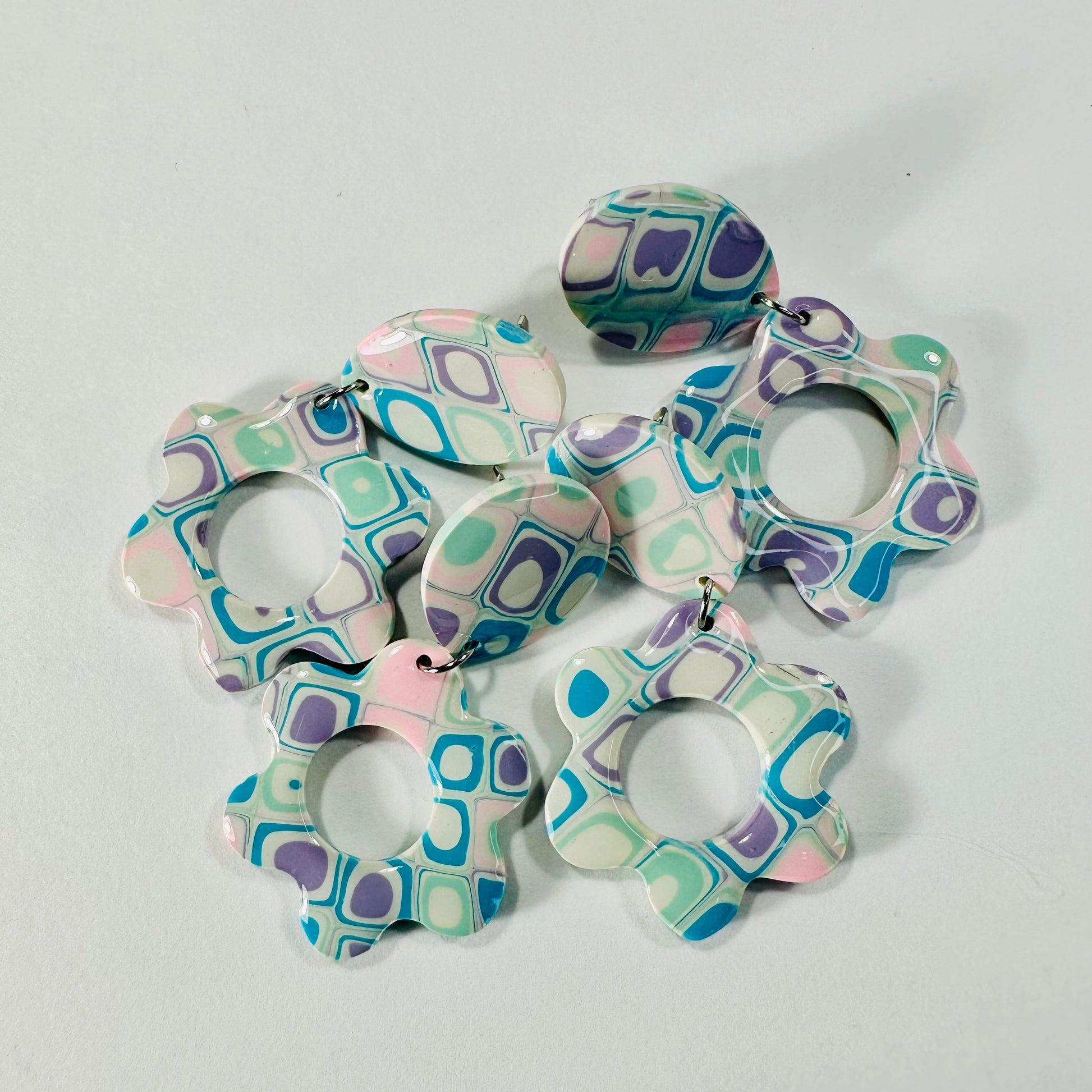 Step back in time with our Retro 70's Style Polymer Clay Earrings, a vibrant tribute to the bold and eclectic fashion of the 1970s. Crafted from high-quality polymer clay, these earrings feature an eye-catching mix of retro blue, pink, purple, and green hues, evoking the playful spirit of the era. Each pair is handmade, ensuring unique variations in colors and decoration that make every set truly one-of-a-kind.