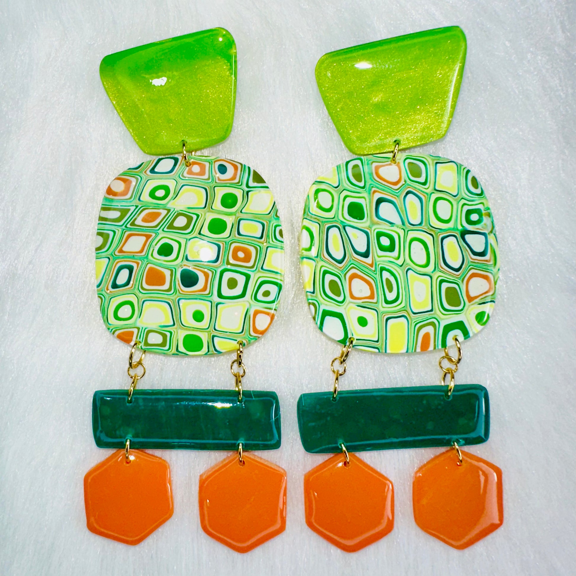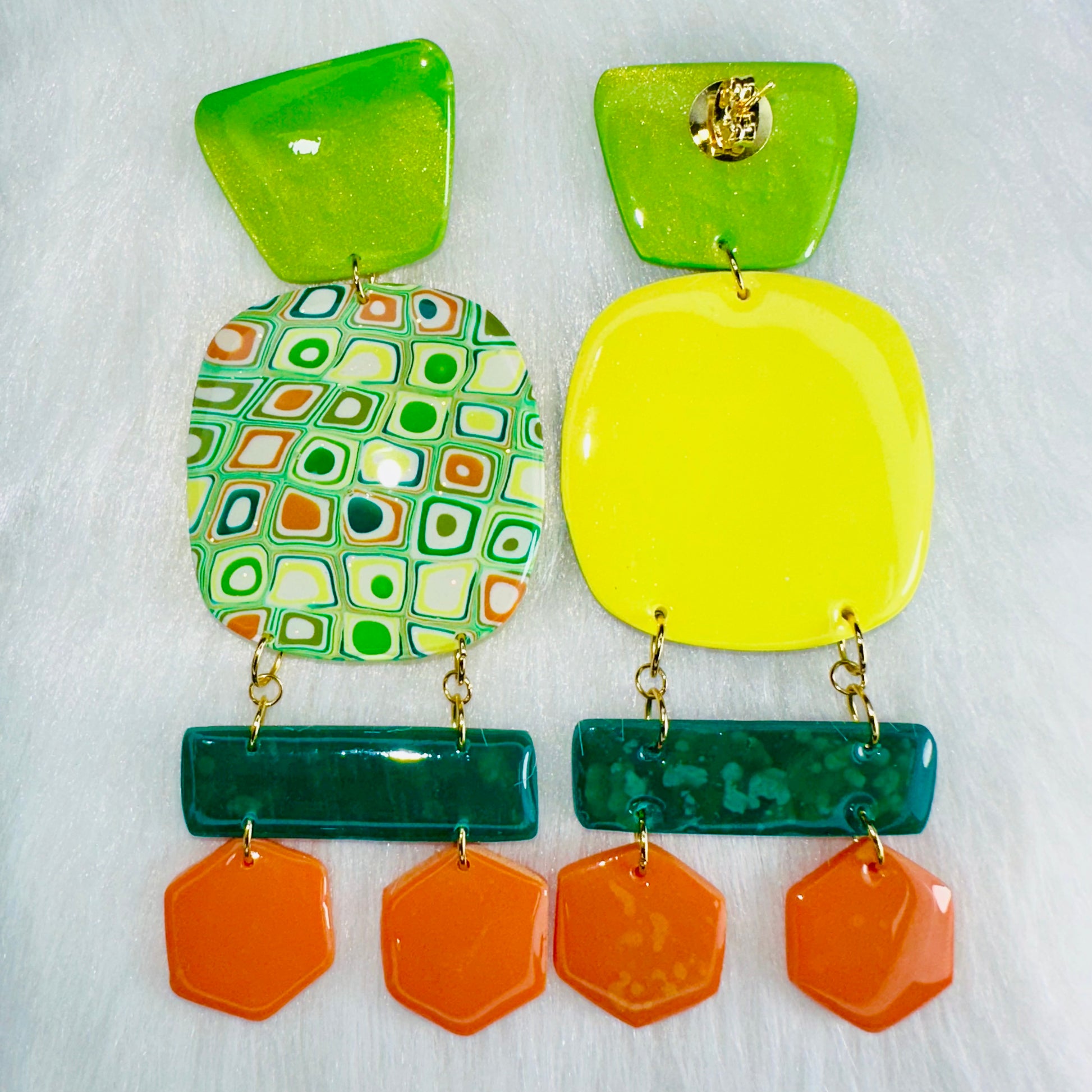 Elevate your everyday look with these vibrant Sunset Grove Dangle Earrings from Vanessa Lee Clay Jewelry. Handcrafted from lightweight polymer clay in a striking mix of earthy green and zesty orange, each pair is coated in a glossy UV resin finish for added durability and shine. The bold, modern silhouette measures approximately 3.5 inches long by 1.5 inches wide—perfect for making a statement without weighing you down.