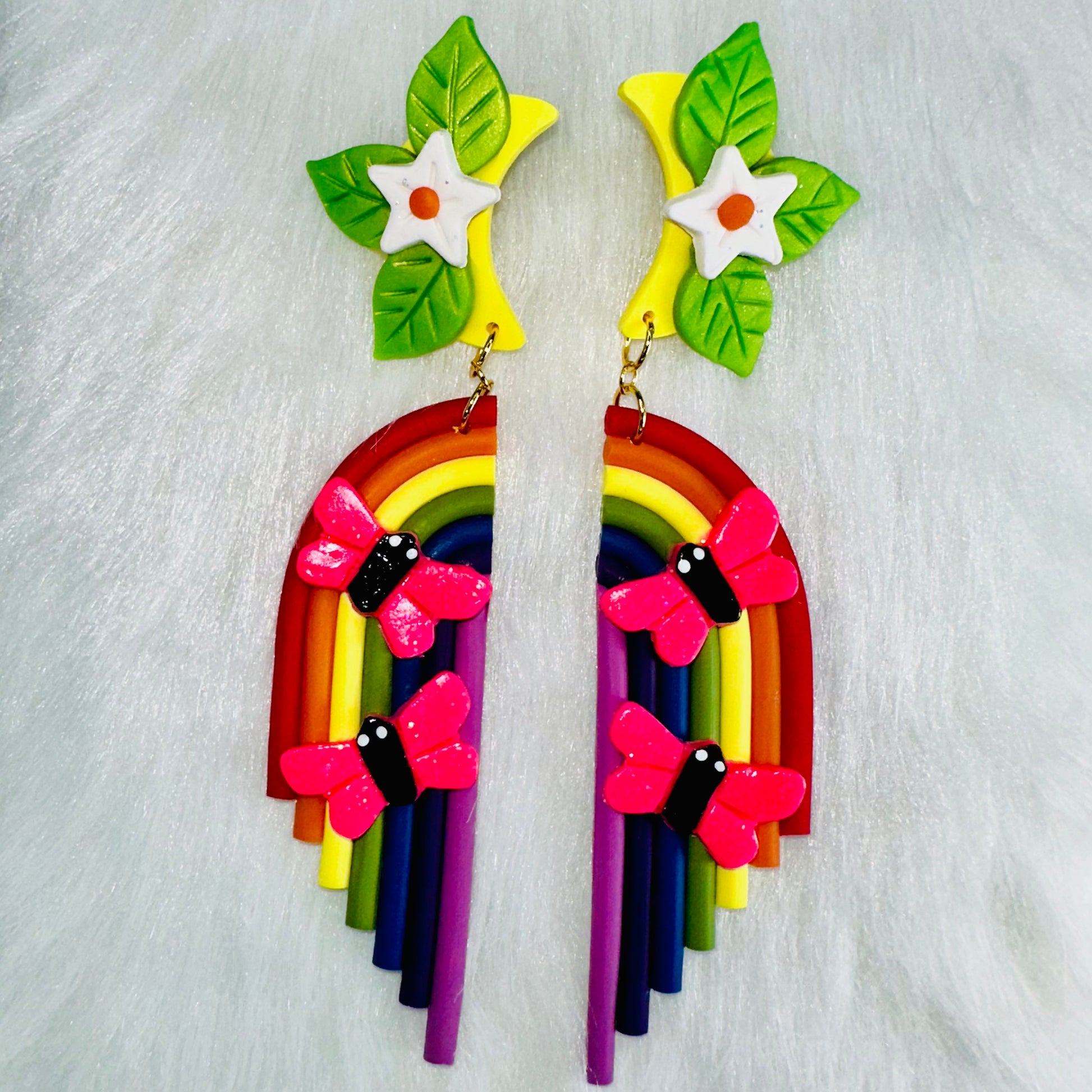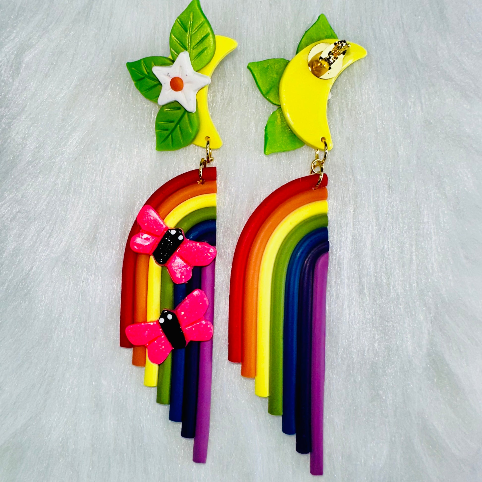Step into a world of color and charm with our Whimsy Garden Dangle Earrings from Vanessa Lee Clay Jewelry. These delightful two-piece dangles feature a playful mix of butterfly, rainbow, and flower shapes, all handcrafted from polymer clay in a joyful multicolored palette.